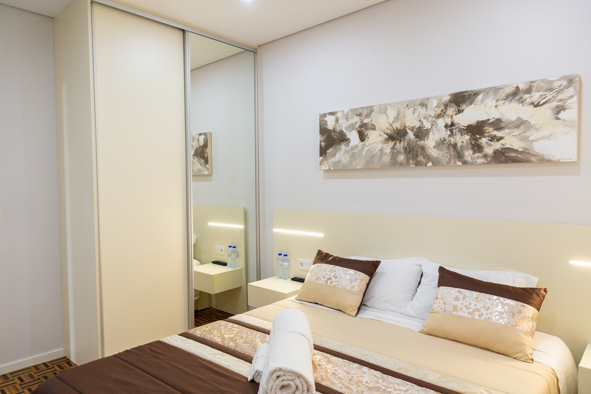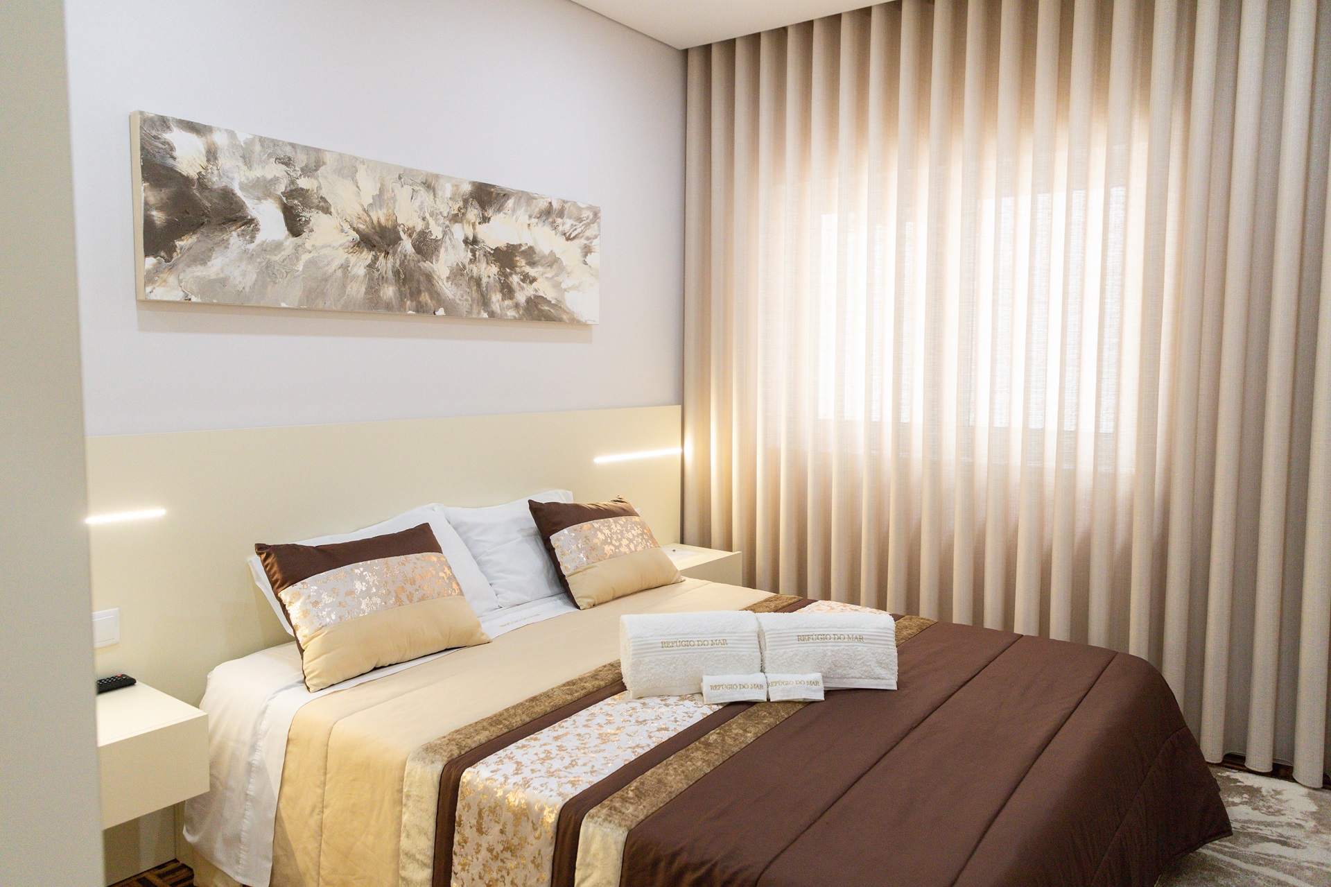 Os quartos estão decorados de forma acolhedora.